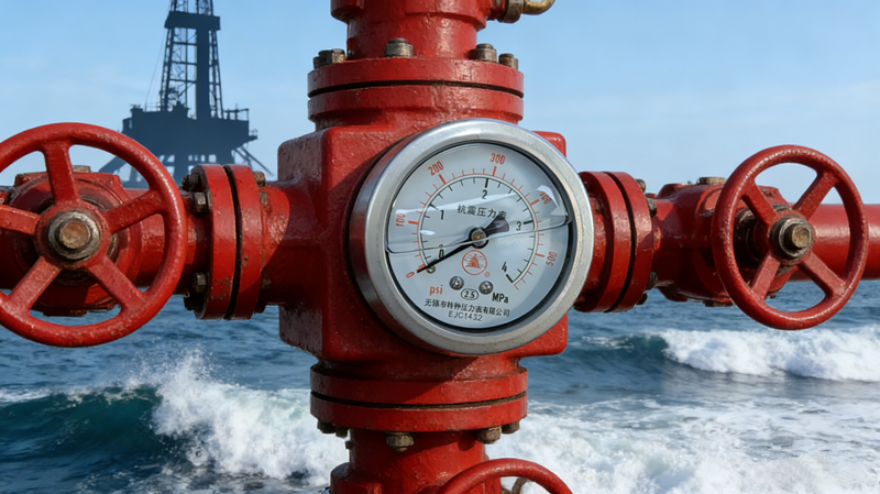 Close-up of the wellhead device on a drilling platform, with a silver pressure gauge embedded in a red high-pressure valve group, the pointer pointing to 25 MPa, and the silhouette of the drilling rig and waves visible in the background).