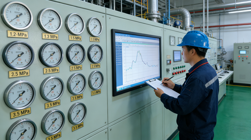 (Panoramic view of the instrument panel in the control room of an oil transmission station, with multiple pressure gauges arranged in a matrix showing pressure values of different pipe sections, engineers recording data, and the screen displaying pressure trend curves.)